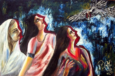 The painting unfolds the aching journey of a woman whose life is scarred by exploitation at every stage, as she endures silent wounds from girlhood through womanhood and into the loneliness of old age, yet continues to stand with quiet resilience..